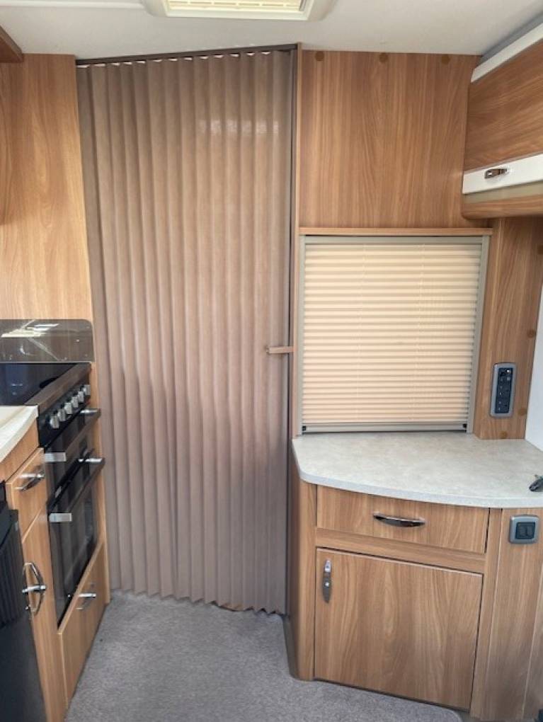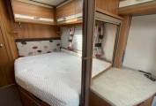The front lounge has 2 parallel sofa seats with a central 2 drawer cabinet with pull out occasional table. A large Heki 2 tilting panoramic rooflight and a central midi Heki rooflight allow lots of natural light to flood in. The sofa seats make up into a double bed or can be used as 2 singles for young children. The kitchen is well equipped with a granite effect sink and mixer tap, dual fuel hob, grill, oven, 3 way fridge with freezer compartment, built in microwave and an Omnivent 3 speed, 2 way roof fan. The fixed french bed lifts up to access a large storage area below. The full width end bathroom has a wash hand basin, vanity mirror, swivel cassette toilet, separate shower cubicle and a heated towel rail. The bedroom and bathroom area can be closed off to give complete privacy. Excellent storage facilities throughout the caravan.