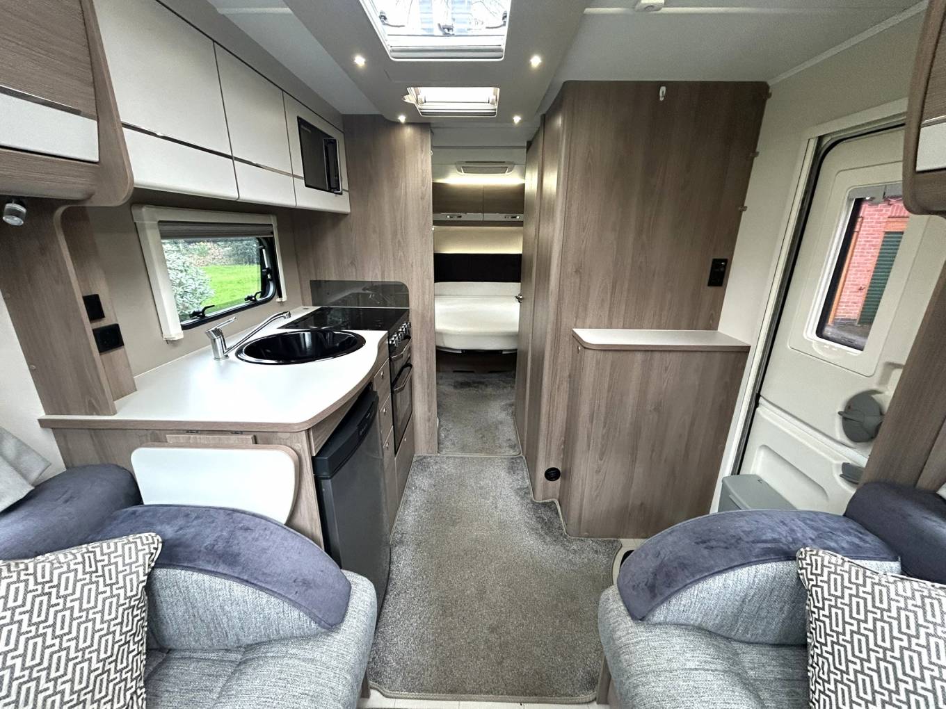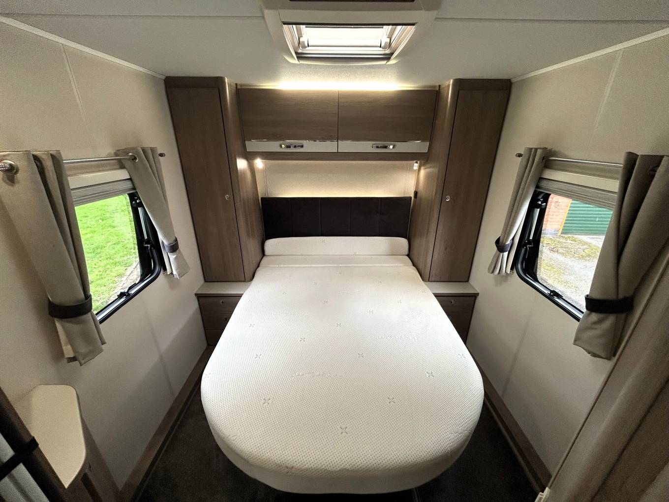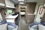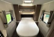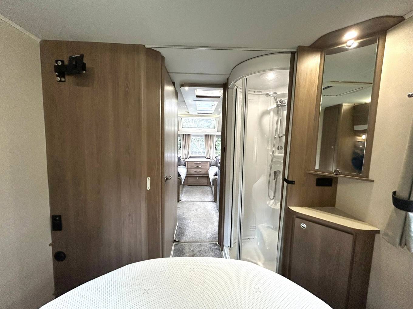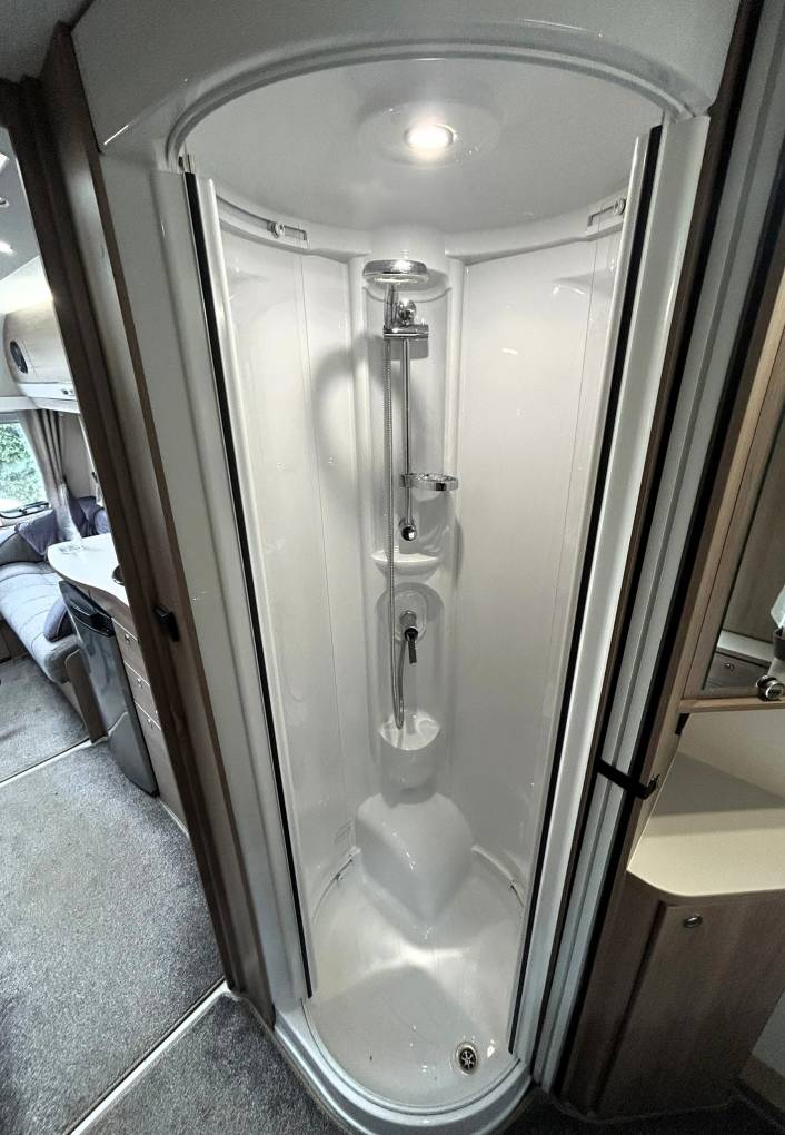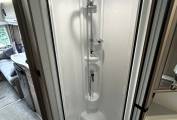 To the rear of the caravan, you will find the spacious end bedroom with an Island Bed, twin built-in wardrobes and overhead storage. The bedroom leads to the washroom area, which provides a roomy separate shower cubicle with the washroom opposite, comprising of a vanity basin unit and a Thetford cassette toilet.