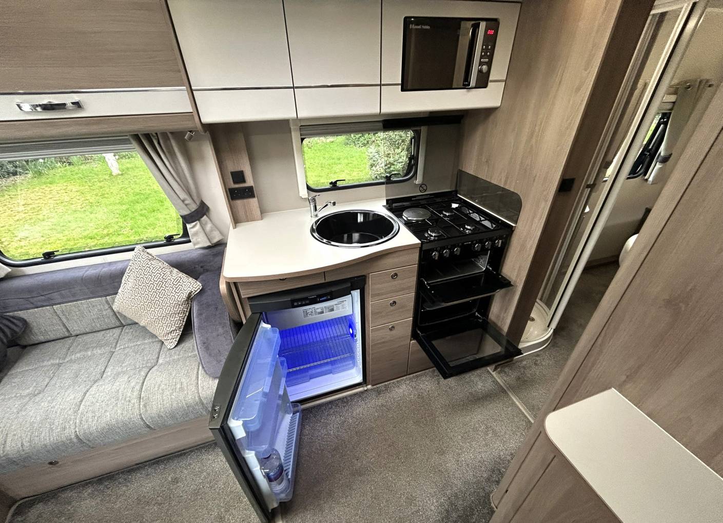 The centre kitchen area is fully functional and houses many appliances, including hob, oven, grill, microwave, fridge with freezer compartment, sink with mixer tap, and plenty of storage.