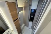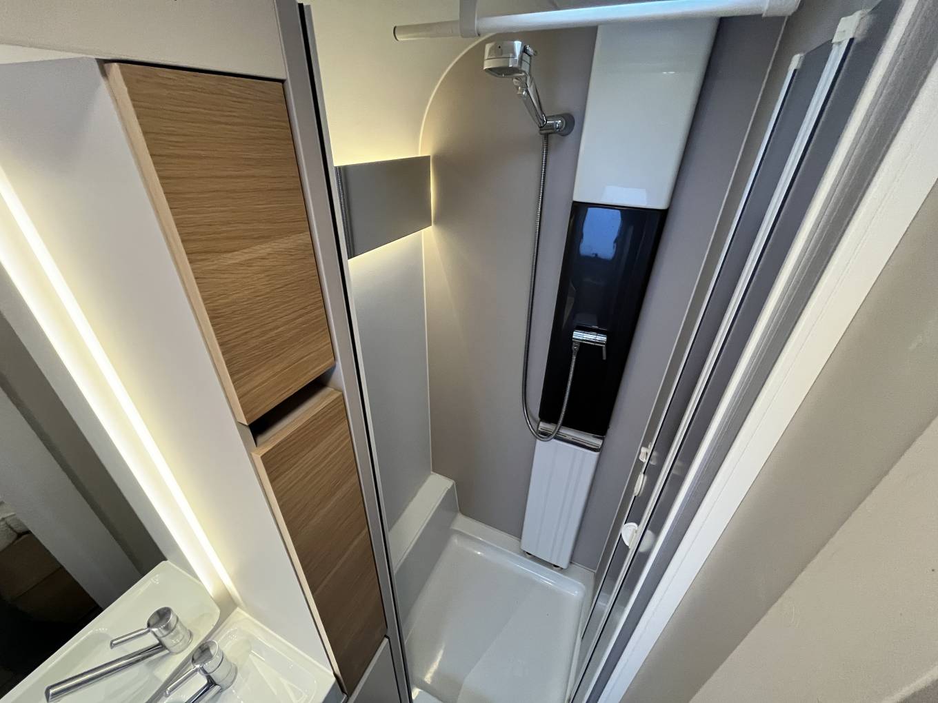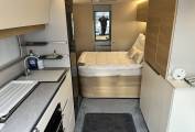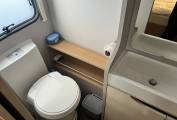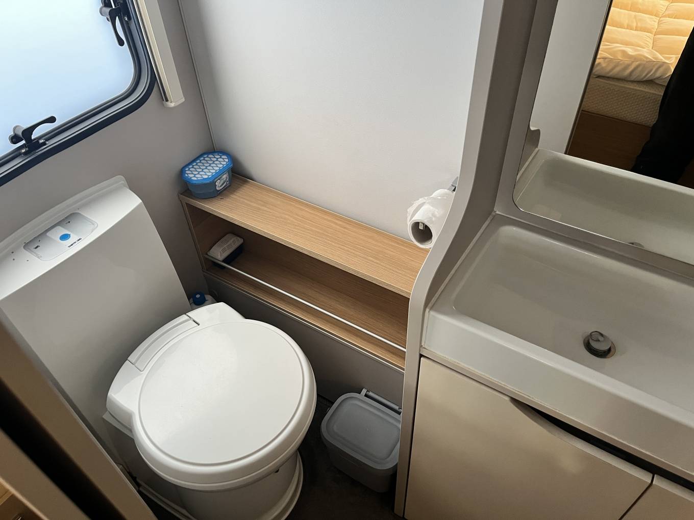 End washroom with shower and cassette toilet, creating good separation between sleeping and living spaces.
