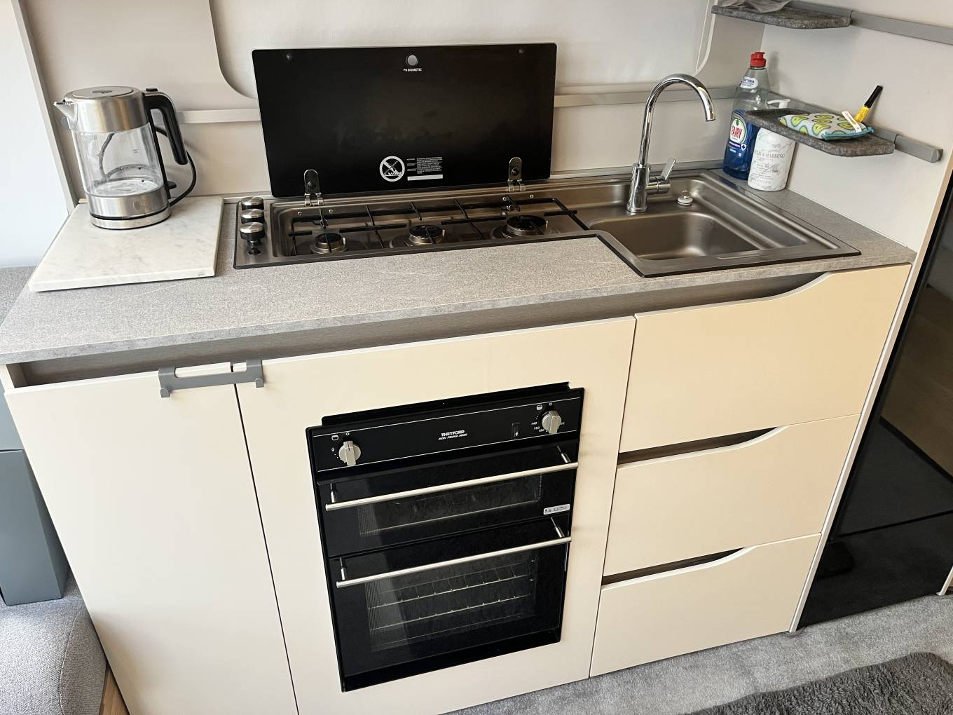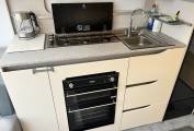 Centre kitchen area with hob, oven/grill, microwave and ample storage.