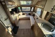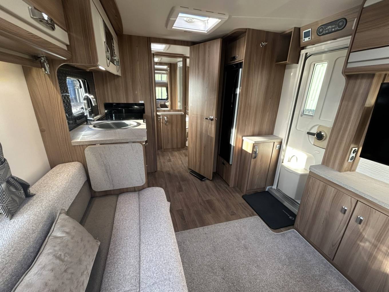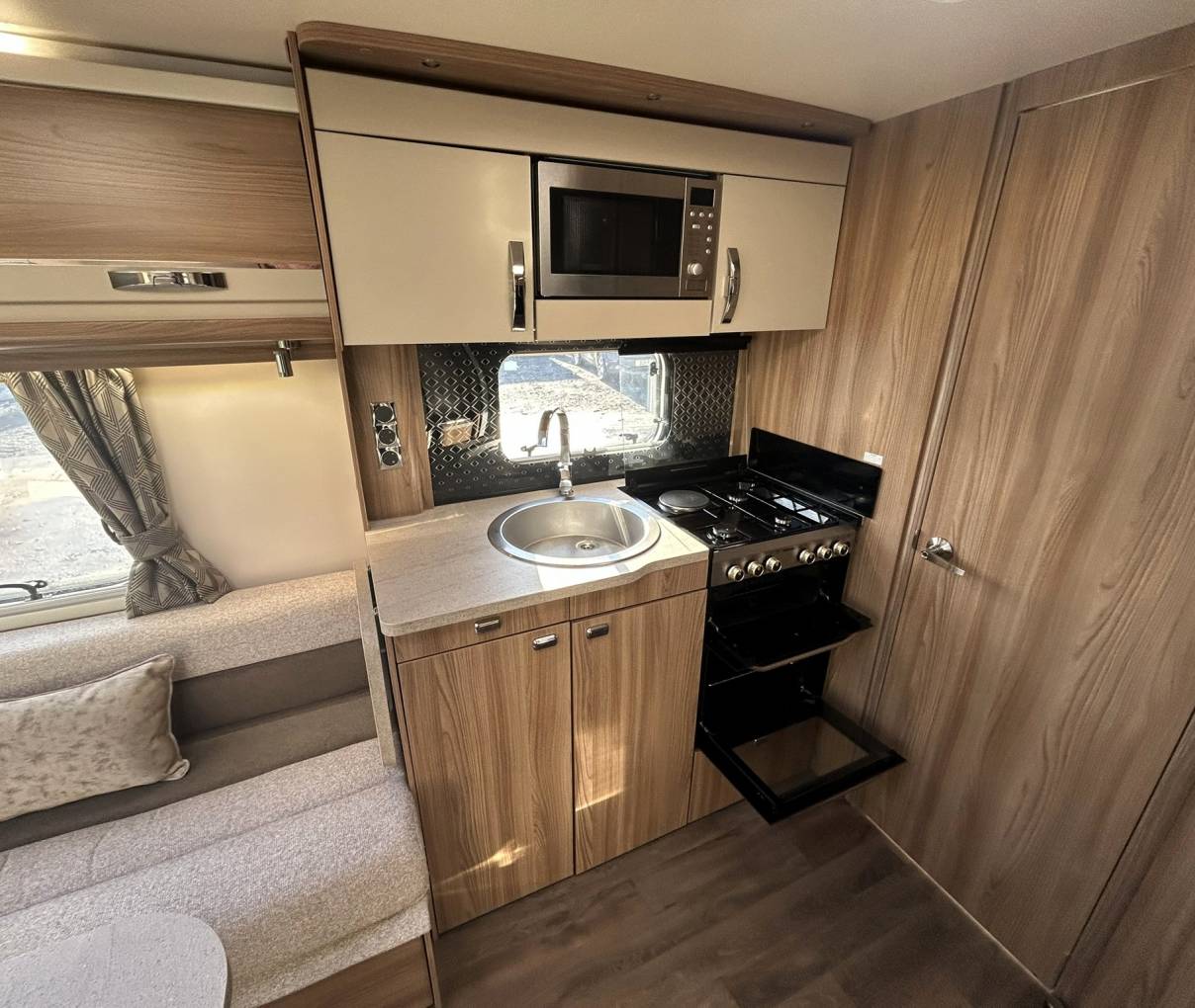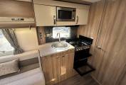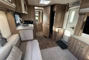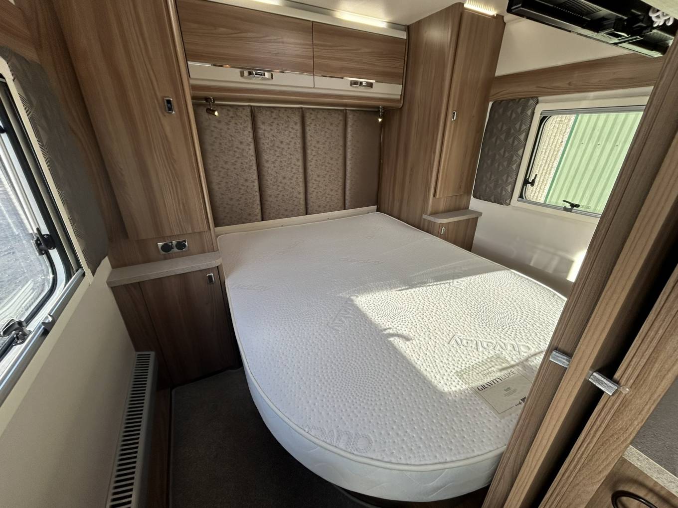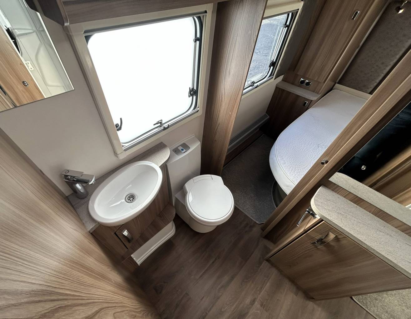 At the rear of the caravan, you will find the elegant and spacious end bedroom with an Island Bed and twin built-in wardrobes and overhead storage. The bedroom leads to the washroom area, which provides a roomy separate shower cubicle with the washroom opposite, comprising of a vanity basin unit and Thetford cassette toilet.