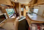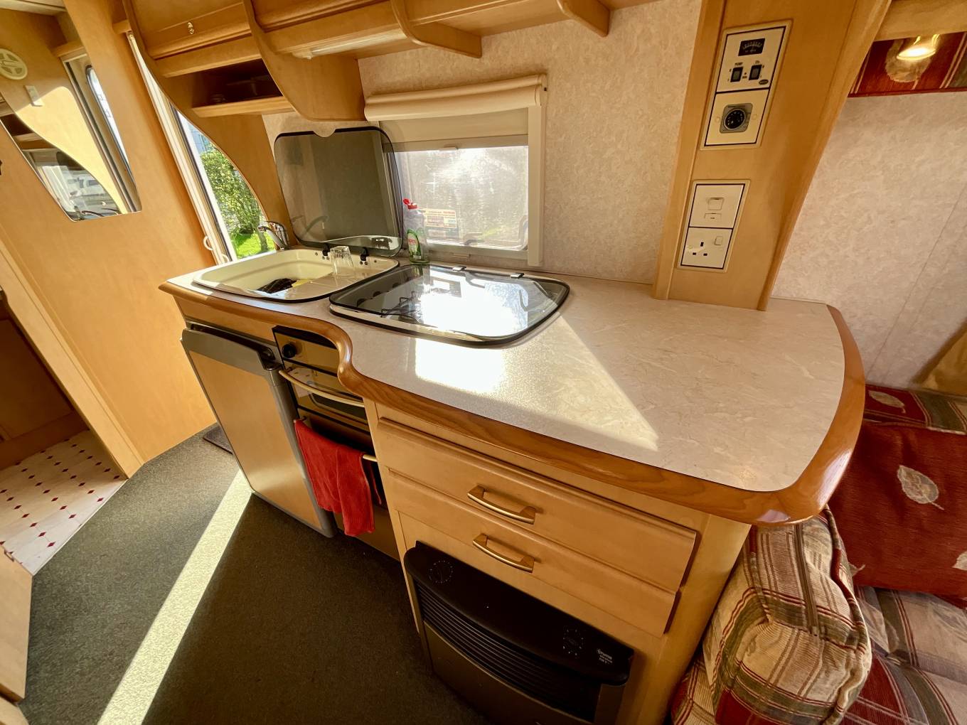 The mid kitchen is well equipped with gas hobs, oven/grill, microwave, sink with water pump and hot water from the Truma boiler, and large fridge/freezer.