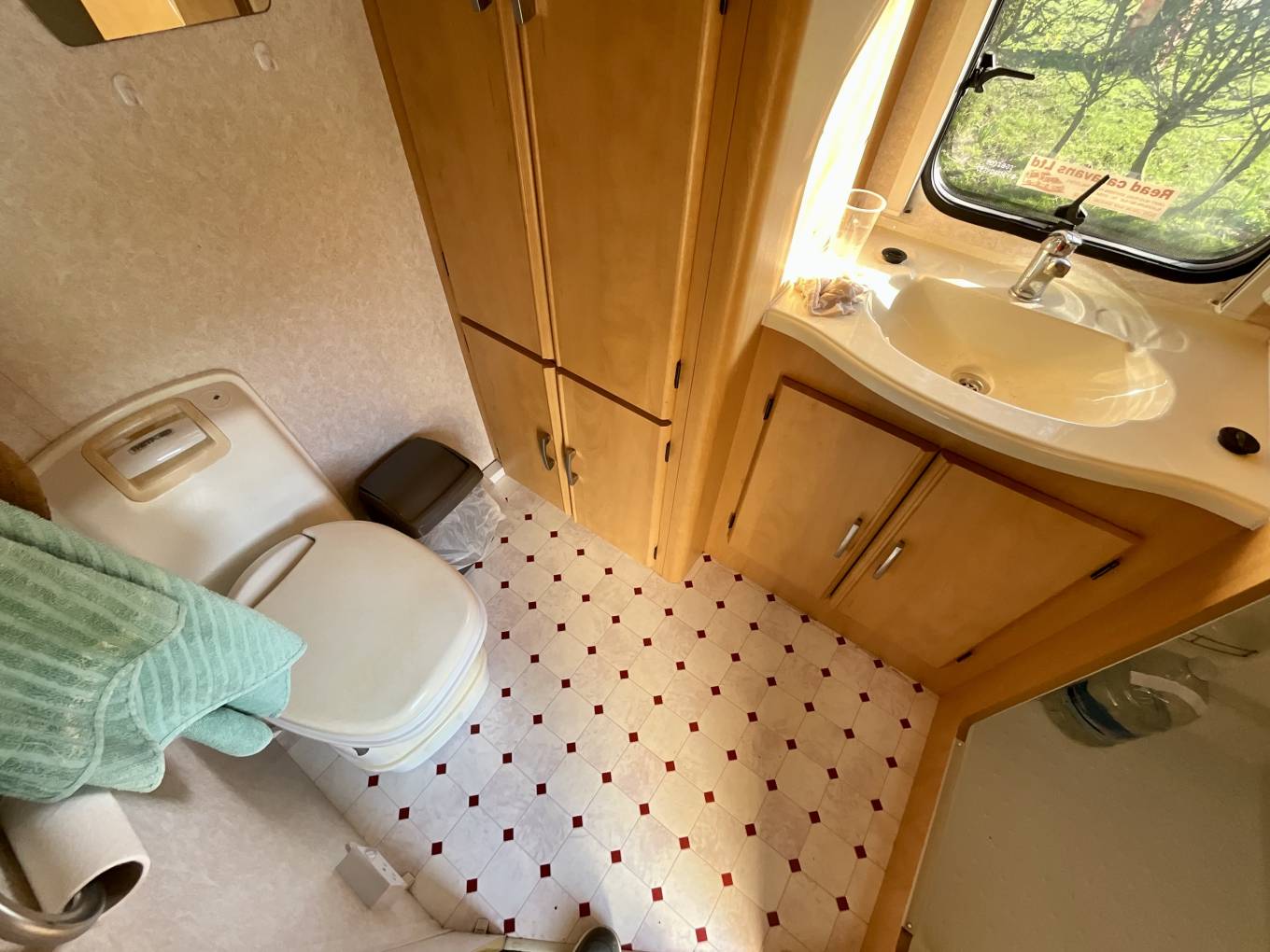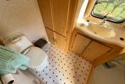 The rear washroom is spacious, featuring a separate shower, Thetford toilet with cassette, wardrobe, washbasin and vanity unit.