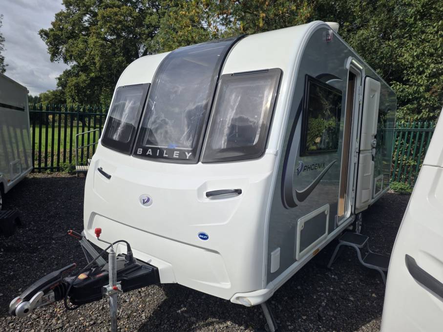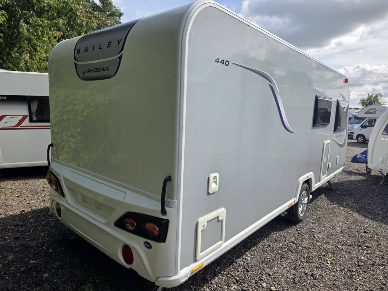 Bailey Phoenix 440 2022 4 berth lightweight touring caravan for sale with motormover. Fixed bed and rear washroom layout. One owner model with full service history and manufacturer bodyshell warranty intact.