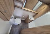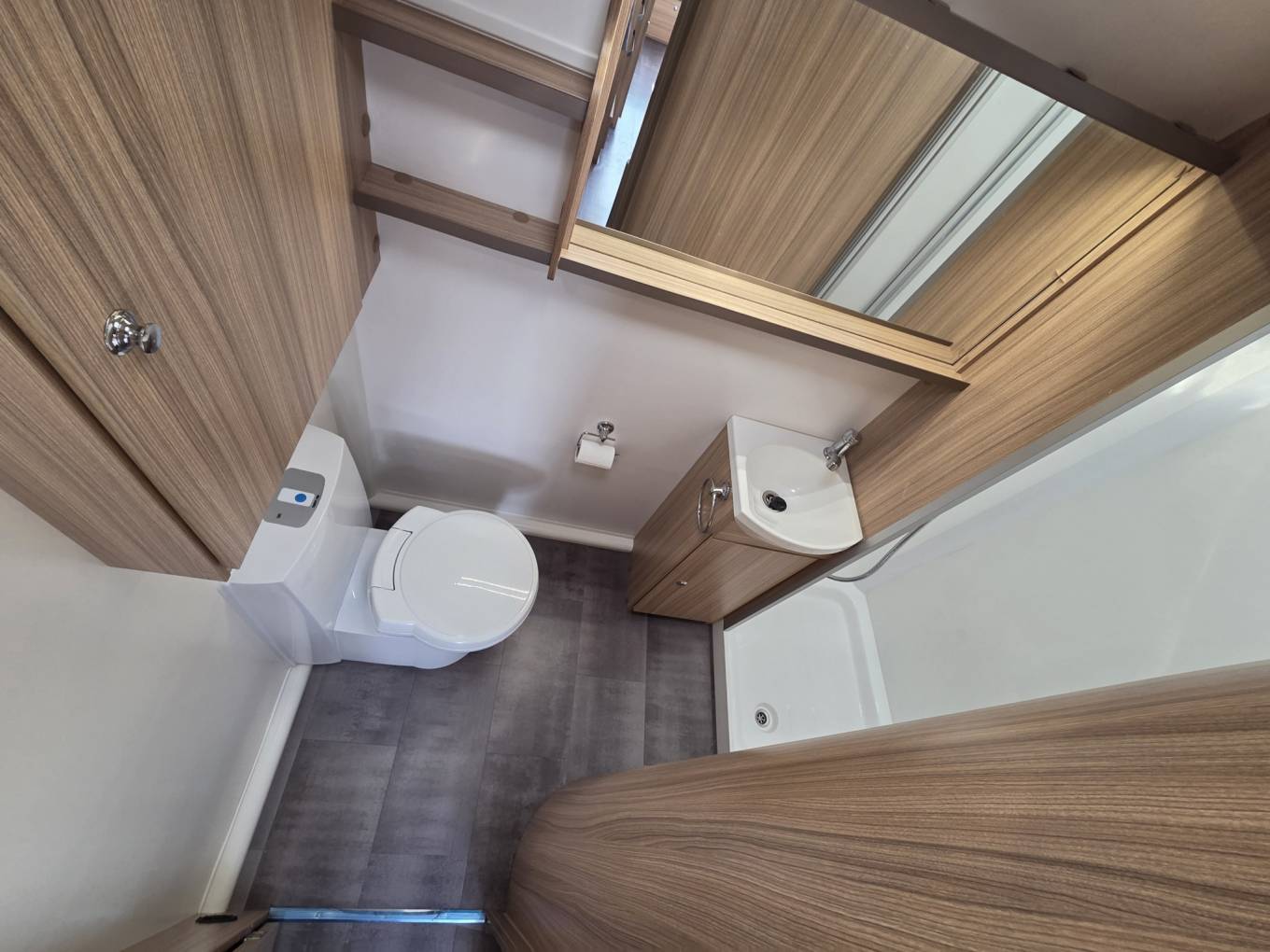 Rear washroom with cassette toilet, separate shower and fixtures.