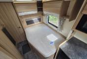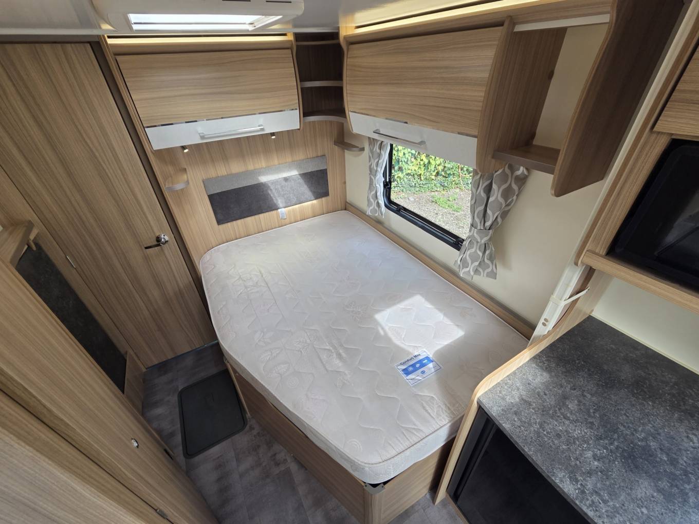 Rear bedroom with fixed double bed. Under bed storage area with outside locker access. Large wardrobe opposite.