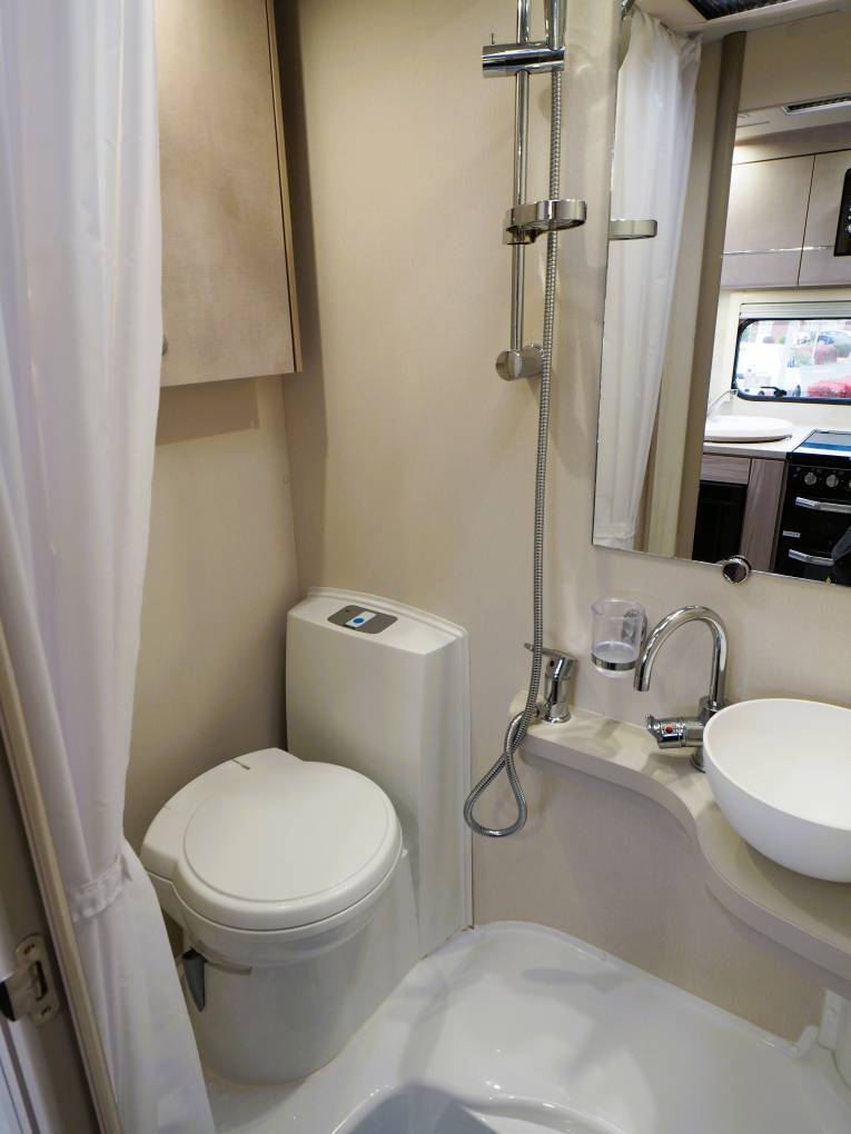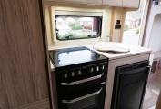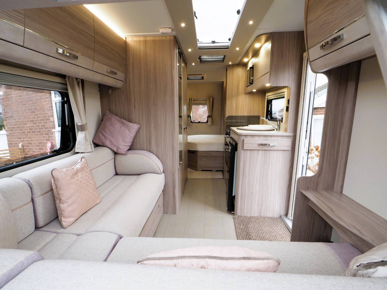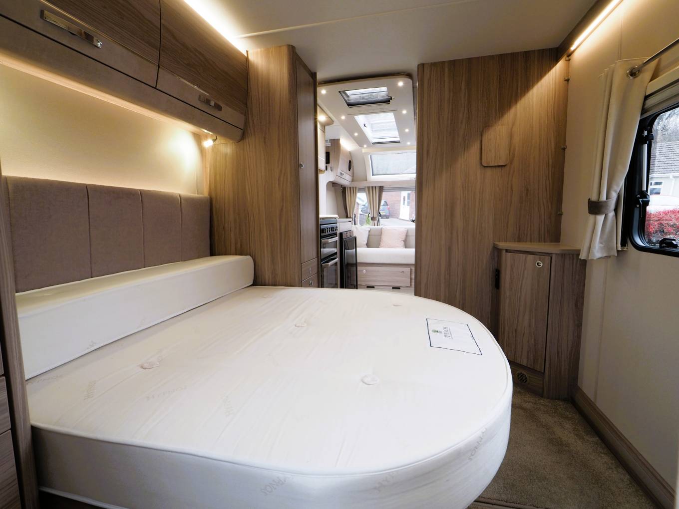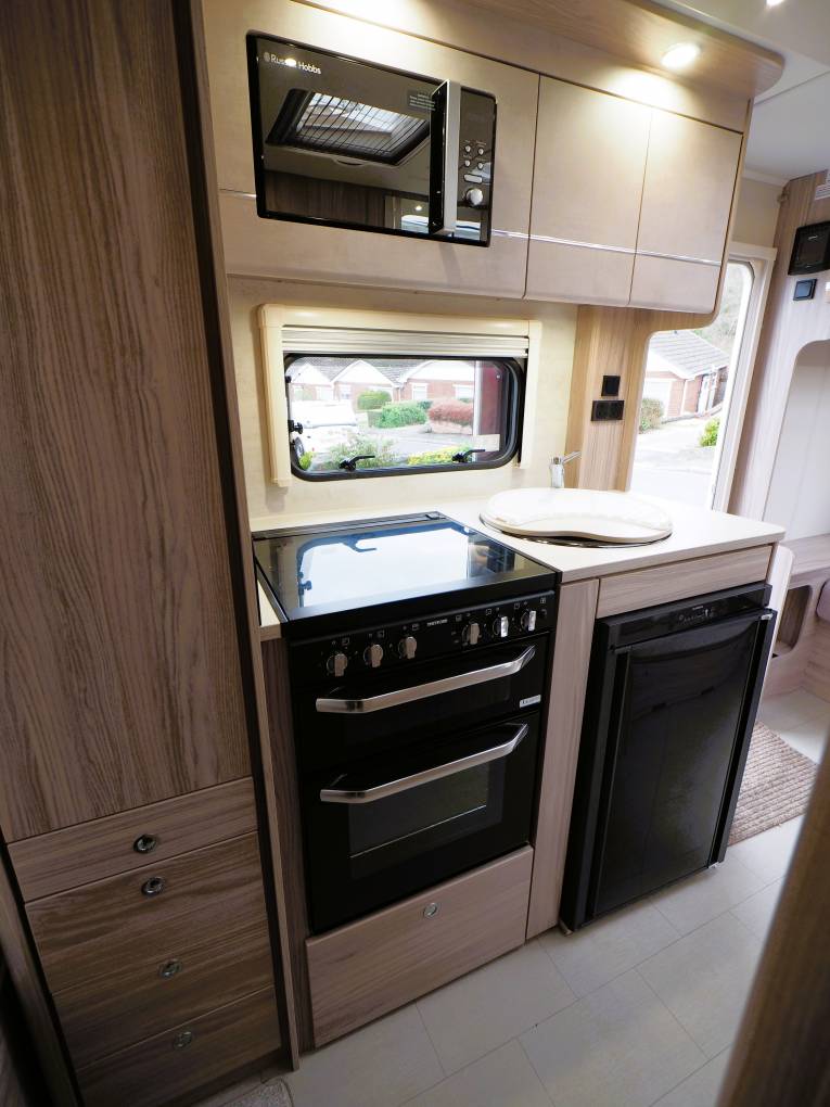 A modern layout designed to maximise space with an L Shaped lounge that provides two good sized sofas with storage under. Additional storage in overhead lockers. Lots of natural light from the large windows and overhead skylight. The drop in table provides a great space to dine and entertain and a large TV shelf to one side can accomodate a large screen TV with ease. TV point and USB points to the corners. Officially a 2 berth caravan the size of the lounge sofas would accomodate a third (adult) and possibly 4th (child) berth. The kitchen is fully equipped with a 3 burner gas hob and electric hotplate, oven with separate grill, microwave oven, sink with mixer tap, 3 way fridge with freezer box and pull out cutlery drawer with additional prep board built in. Storage in the overhead lockers and under oven cupboard. A private washroom offers a flushing cassette toilet, basin with mixer tap with vanity mirror above, overhead shower and storage.
