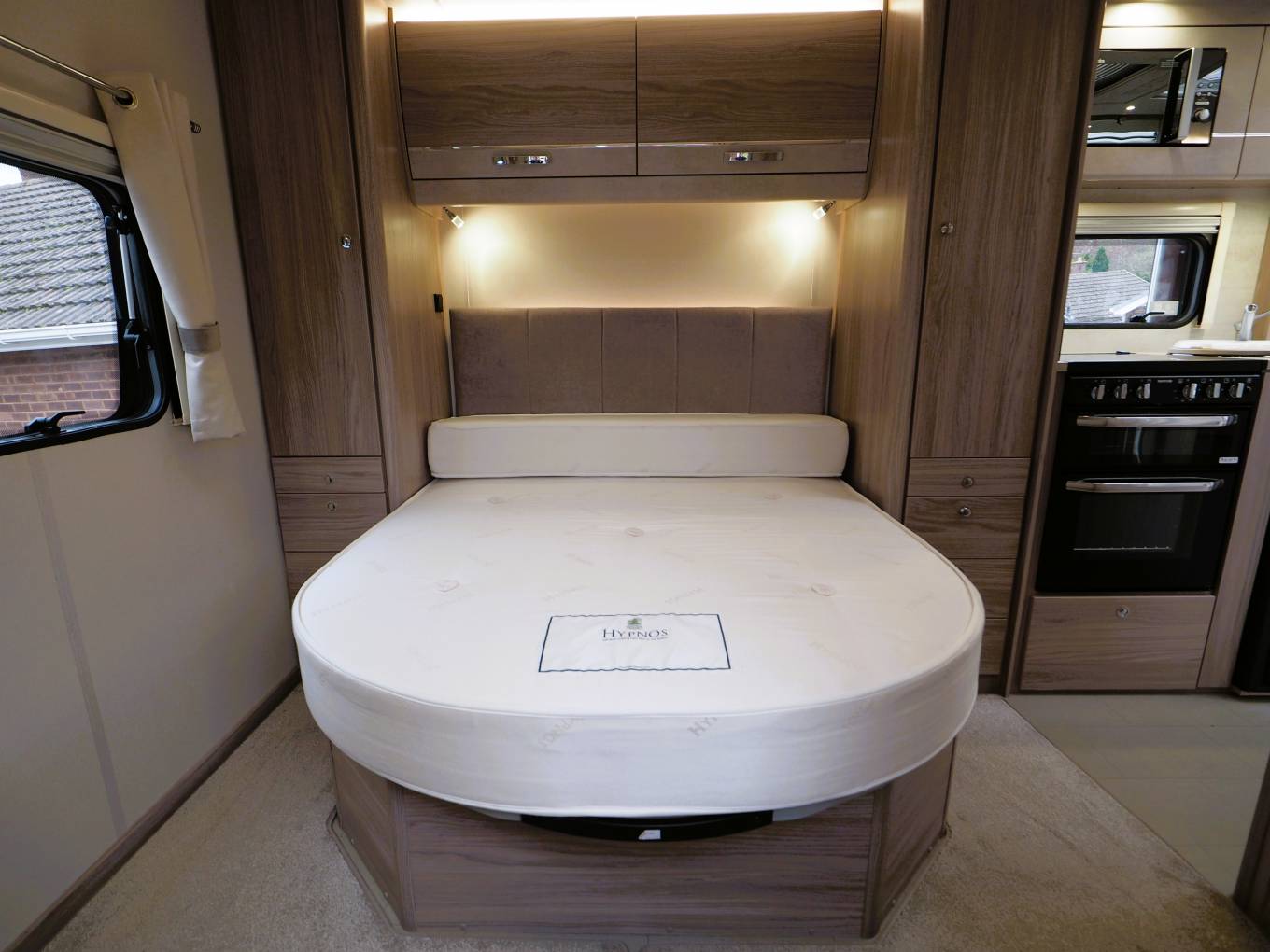 To the rear is a fabulous fixed island bed with premium Hypnos mattress. Hanging wardrobes and drawers and pull out side tables to both sides, two corner storage units with vanity mirror and TV point and the bed lifts on gas struts to gain access to the large underbed space.