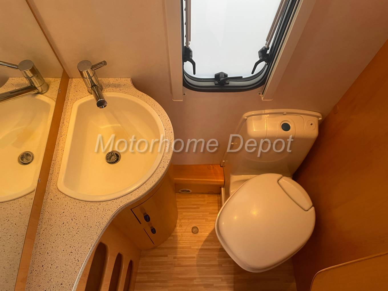 - Moving rear is the bathroom which consists of a Thetford cassette style toilet with electric flush; above a white sink with chrome mixer taps. Adjacent is the hanging wardrobe over the Truma gas heater.