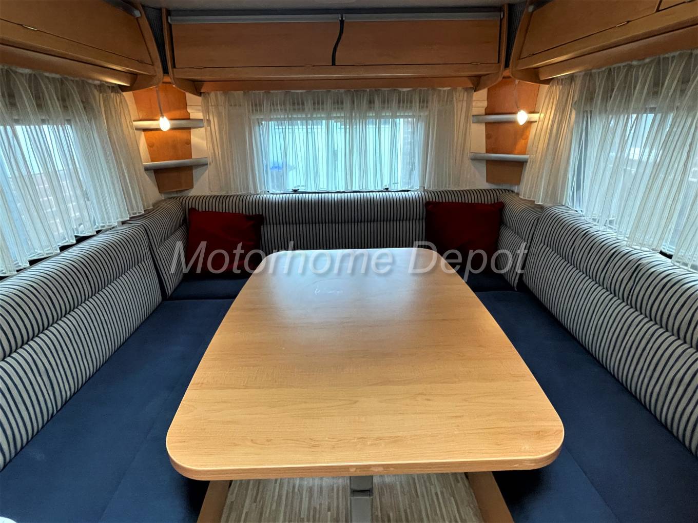 - Finally to the rear is the large dinette that can easily seat 6 people around if entertaining on site. At night the free standing table drops down to make the large double bed. There is plenty of storage under the seat bases.
