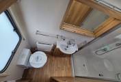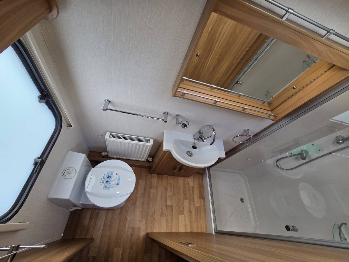 Full width rear washroom with cassette toilet, large separate shower, hand washbasin, LED mirror and fixtures.