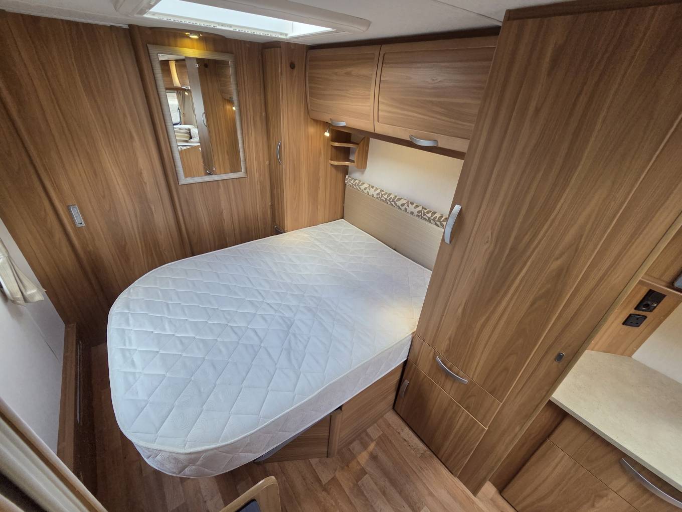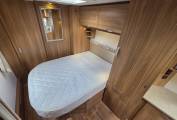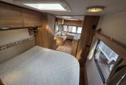 Mid-rear bedroom with transverse fixed island double bed. Under bed storage area with outside locker access. Wardrobes and cupboards either side of bed with opposite dresser/TV area.