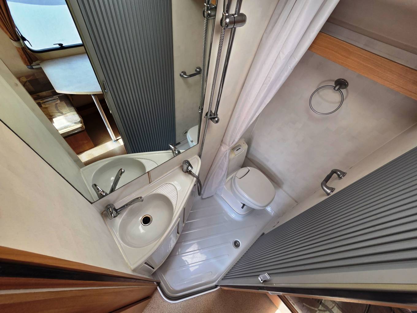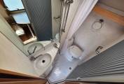 Rear corner washroom with cassette toilet, shower, hand washbasin, cupboards and fixtures.