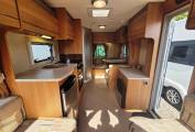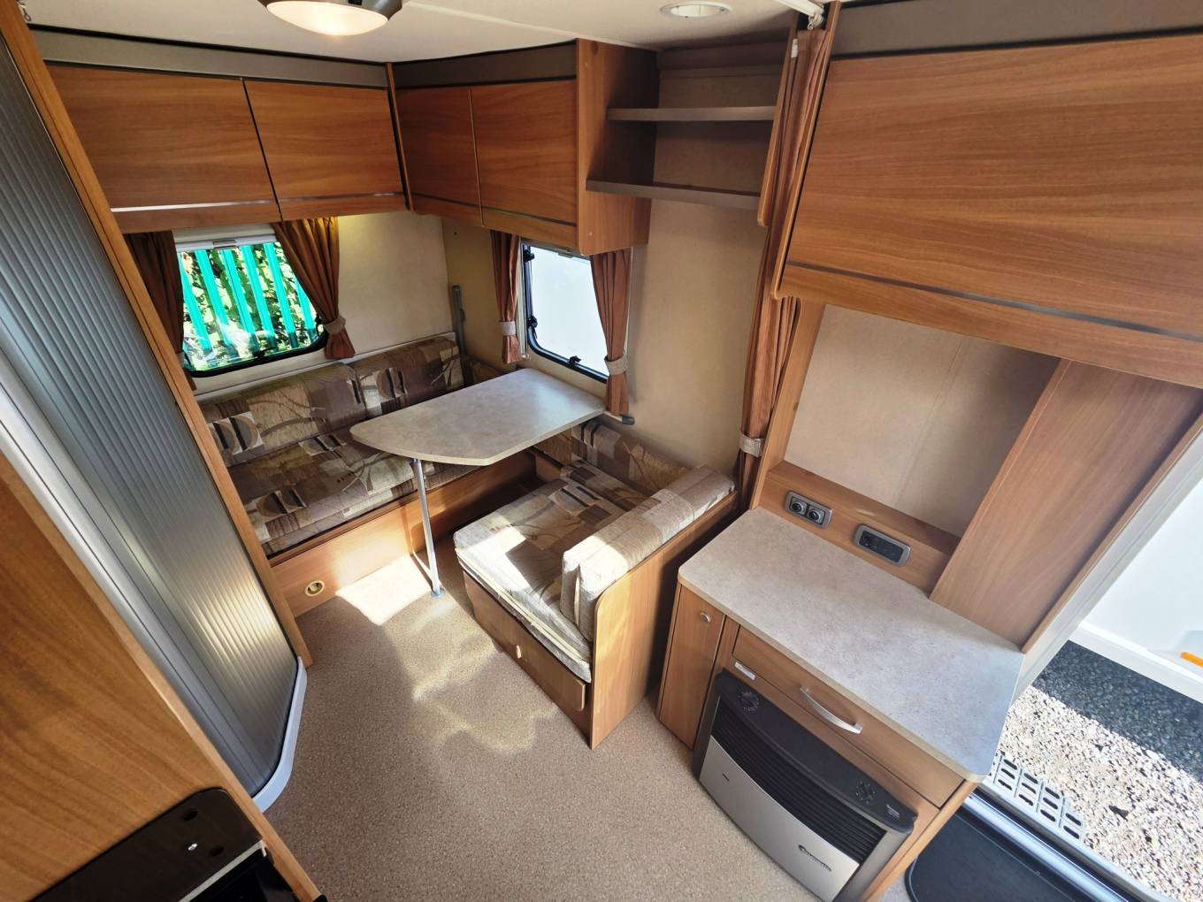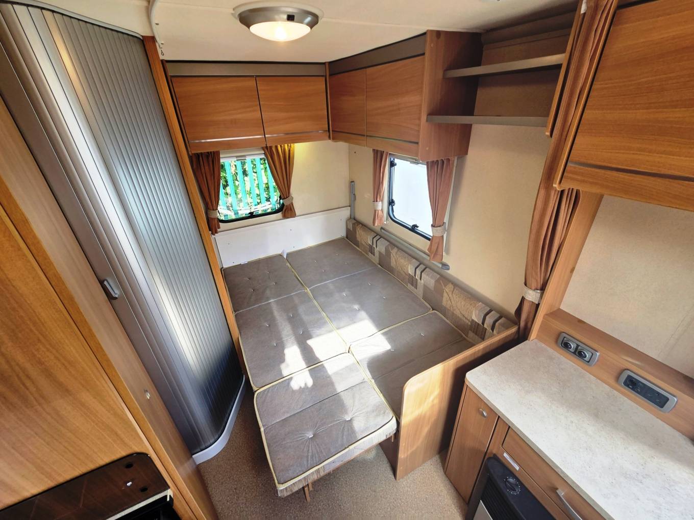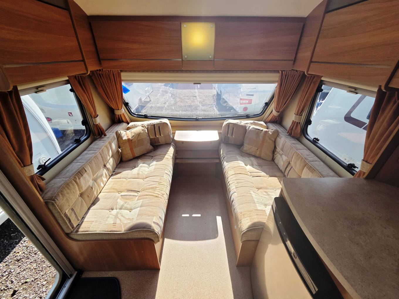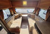Very large rear dinette with parallel sofa seats and central dining table. Dinette easily converts into double bed, bunk beds, or double bed with bunk bed.