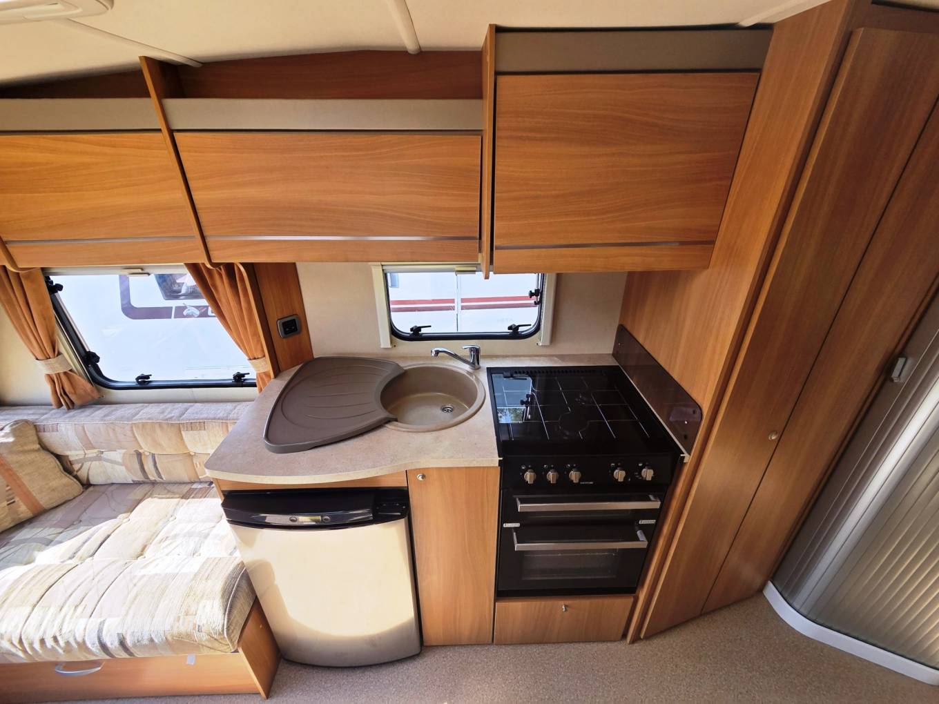 Centre kitchen with hobs, grill, oven, 3-way fridge, sink, draining area, microwave cupboard and cupboards.