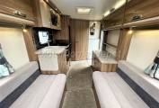 Moving forward is the kitchen situated on the offside which consists of: white bowl shaped sink with chrome mixer tap; extendable work surface leaf; full size oven & grill; 4 burner hob with one 240v hotplate for use on site.There is plenty of cupboard & drawer space above and below for all your holiday provisions and a Microwave oven again for use when plugged into the mains. The fridge & freezer is a large Dometic absorber unit which is fully automatic and can be powered by 240v,12v or gas. Opposite is a large dresser unit with plenty of storage again and a TV point for your evening entertainment.Moving forward is the large lounge area with two opposing sofas that could easily seat 6 around the table if entertaining on site. There is a central storage unit that makes into an occasional table for just two. At night the sofas can be used as single beds if required or the whole area makes up into a large double using a combination of the sofa cushions.