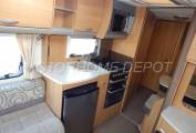 The kitchen is well specified with a round sink and chrome mixer tap, there's a chopping board and draining board stored in a locker below, a dual fuel hob with 3 gas burners and an electric hotplate, gas grill and oven below, a built-in Sanyo microwave oven, a Thetford 3-way powered fridge with freezer box, plus plenty of cabinets and cupboards to store away your holiday provisions.
